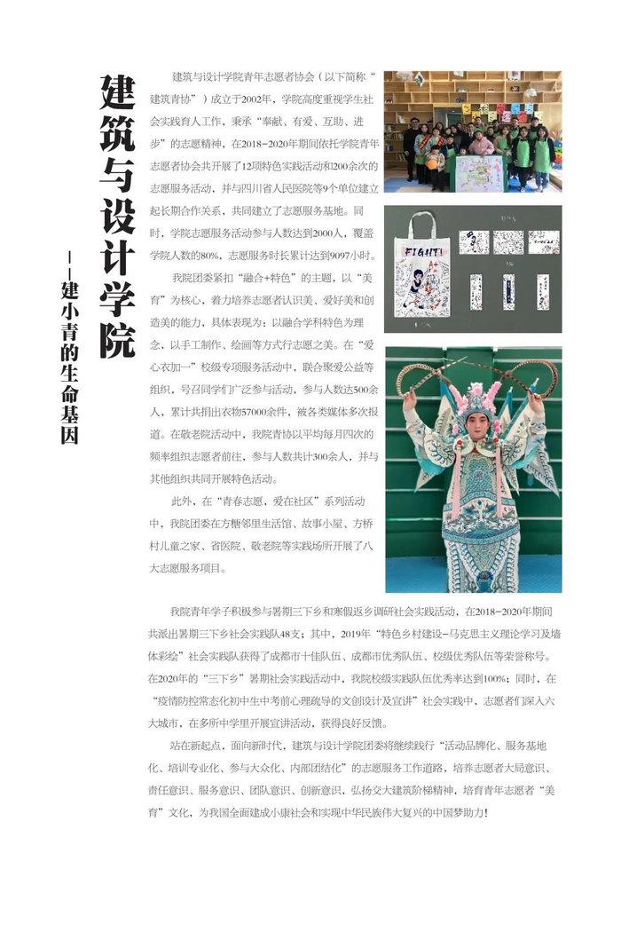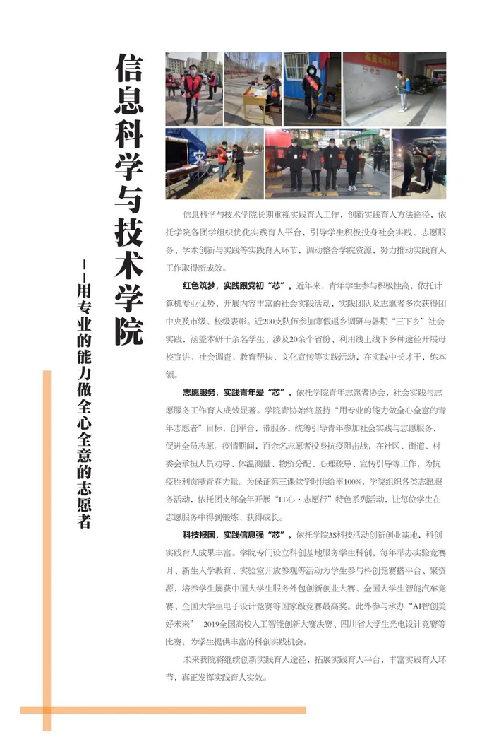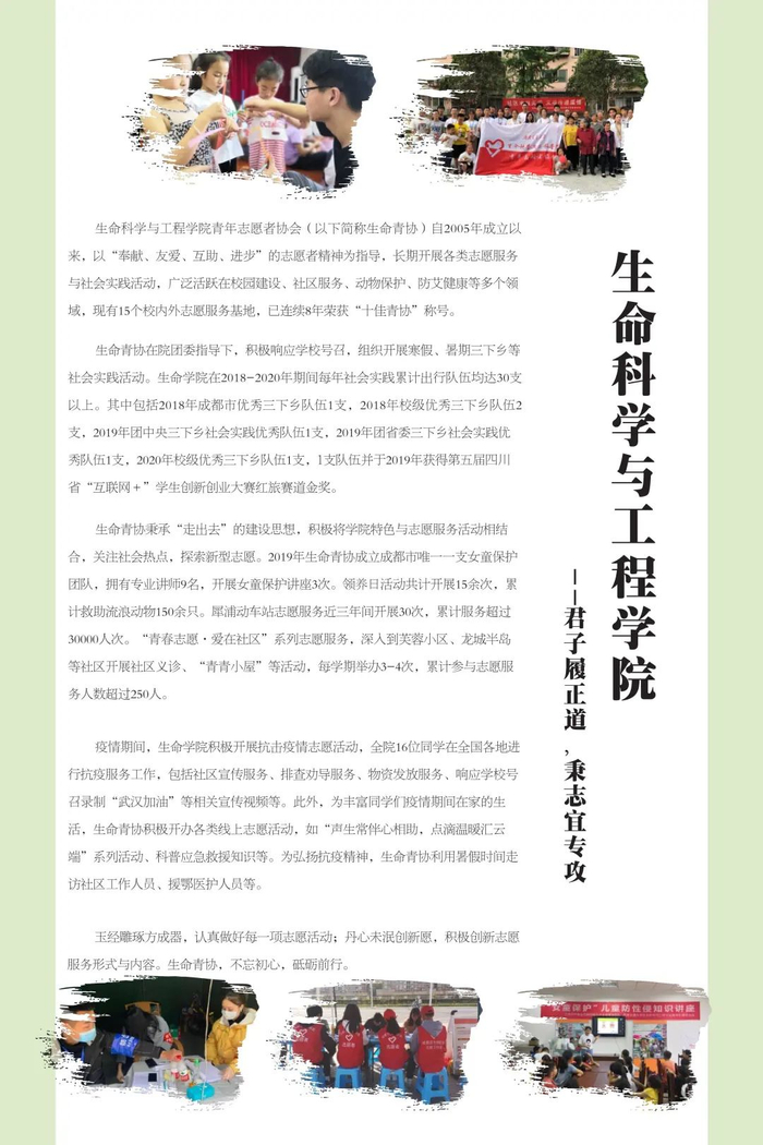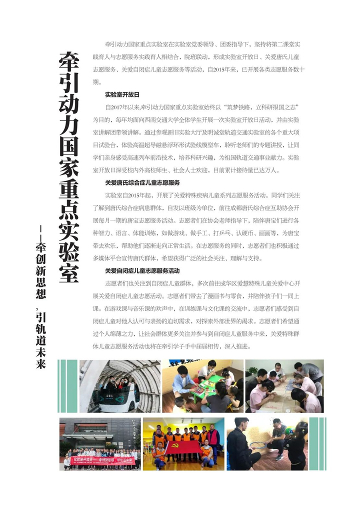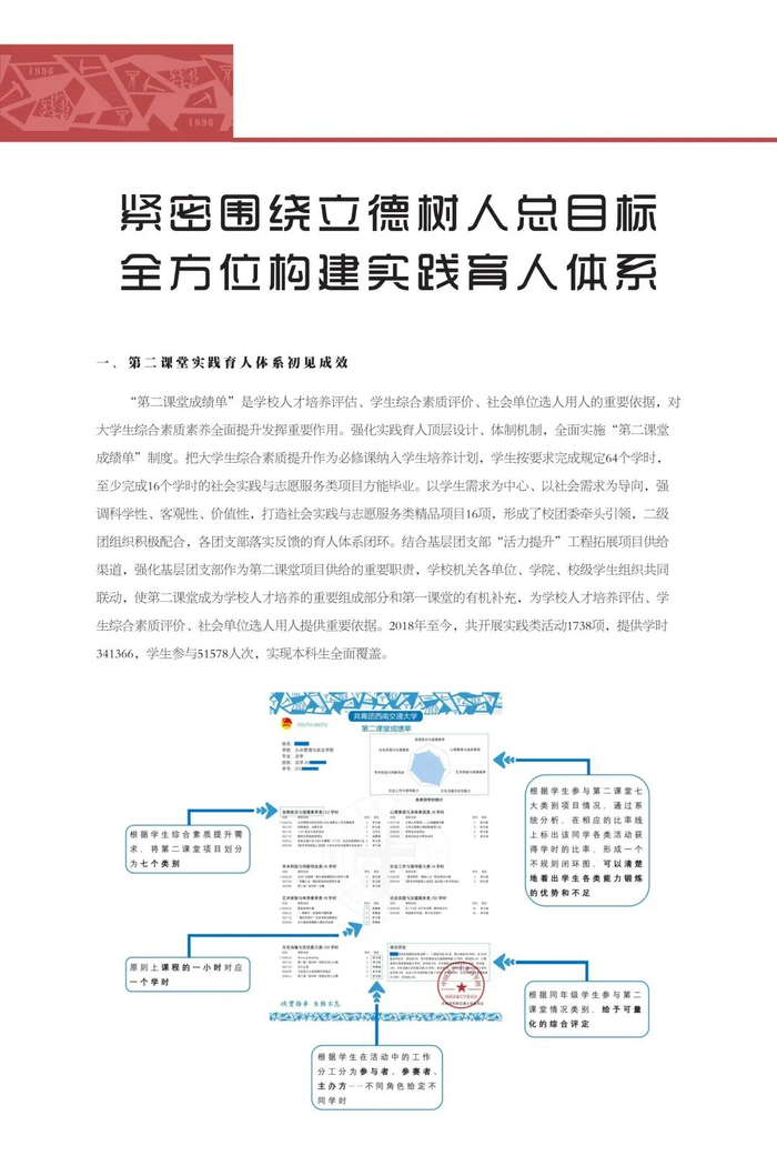 实践育人是新形势下高校教育教学工作的重要载体,是推动形成全员全过程全方位育人的有效途径。西南交通大学高度重视实践育人工作,以新时代学校思想政治工作和“双一流”建设工作为牵总,围绕立德树人的根本任务,强化育人实效,坚持理论教育与实践养成相结合,以学校第二课堂为载体,通过整合各类实践资源,强化项目管理,丰富实践内容,创新实践形式,拓展实践平台,完善支持机制,教育引导青年学生在亲身参与中增强实践能力、树立家国情怀,让“奉献、友爱、互助、进步”的志愿精神蔚然成风。