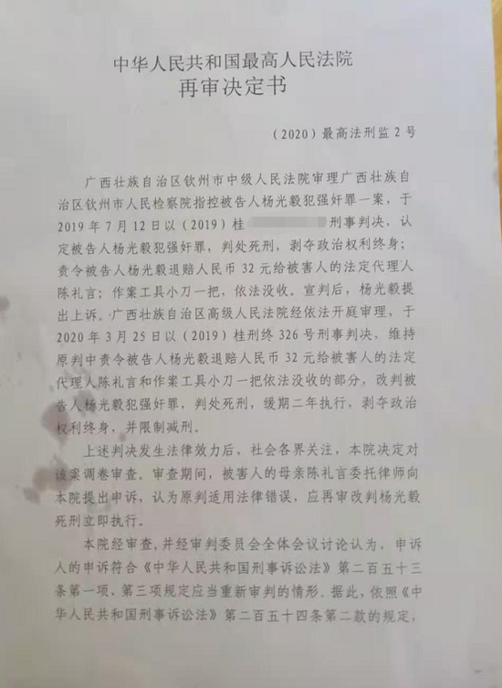 11月11日,据最高人民法院官方网站发布消息称,最高人民法院调卷审查的原审被告人杨光毅强奸一案,其间被害人母亲提出申诉。最高人民法院审查决定,指令广西壮族自治区高级人民法院另行组成合议庭对该案进行再审。
