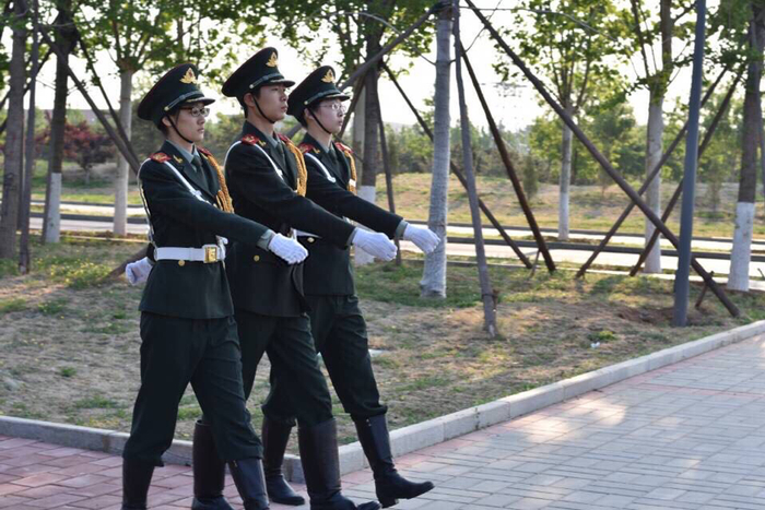 图为赵然(左一)在执行国旗护卫队升旗任务
