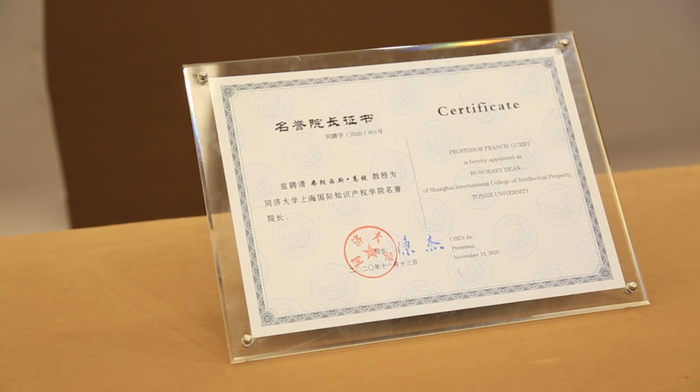 11月13日,世界知识产权组织(WIPO)前任总干事弗朗西斯·高锐(Francis Gurry)博士受聘同济大学上海国际知识产权学院名誉院长仪式在上海举行。高锐博士通过视频连线出席仪式。国家知识产权局局长申长雨发来贺信,上海市政府副市长陈群、同济大学党委书记方守恩出席并用英语致辞。上海市知识产权局局长芮文彪、市教委副主任李永智、市知识产权局原局长吕国强等出席聘任仪式。聘任仪式由同济大学副校长雷星晖主持。芮文彪代为宣读申长雨的贺信。同济大学700余名师生线上线下参加仪式。