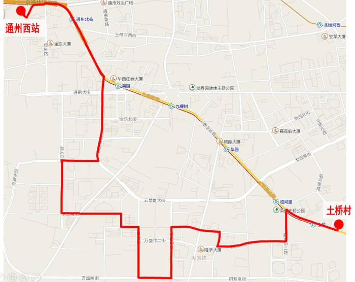 中途设站:通州小街桥东、五所南路东口、五所南路、云景里北区、五所南路西口、云景西路北口、地铁九棵树站。