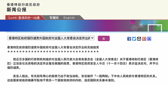 港府也强烈谴责外国政府对全国人大常委会决定作出的无端指责。