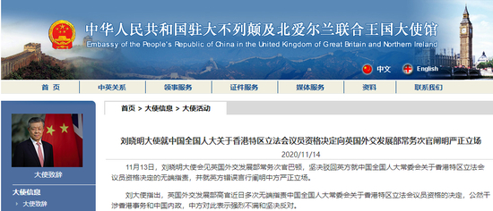 我驻英国大使刘晓明向英方阐明严正立场:英方固守意识形态偏见,大搞双重标准,一再借《中英联合声明》无端指责中方未履行国际义务,完全是颠倒黑白、混淆是非。