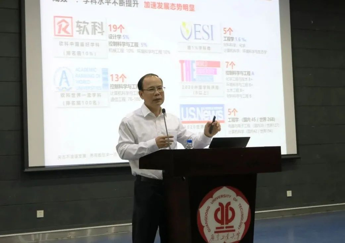 校长邱学青为新入职教工讲述广工的校情校史,题目为《矢志不渝谋发展 勇闯敢创冲一流》。邱学青用一张张老照片把老师们带回到广工的过去,看到了一代又一代广工人不懈地坚持与努力成就了广工的今天。“广工的明天,更是需要每一位教工的努力!”邱学青希望,新广工人爱国、爱校、爱家,身先垂范、苦练“内功”、锻炼身体,融入团体。