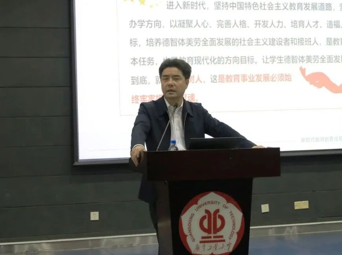 学校党委书记胡钦太为新教工讲授思政第一课,题目为《立德树人勇担当 不忘初心正师风 —— 新时代教师的责任和担当》。胡钦太指出:立德树人,是高校立身之本;教书育人,是教师的初心,学校与教师要相辅相成、相互成就。他提出,谁来“立德树人”?我们,高校教师!斩钉截铁的话语让人为之振奋。接着,胡钦太从守初心、铸师魂、勇担当三个角度谈立德树人的重要价值、时代内涵和高校教师的责任与要求。希望老师们牢记使命:为党育人,为国育才,时刻牢记立德树人的责任和担当,在广工大的各个岗位上履职尽责,为培养出更多更好的能够担当民族复兴大任的时代新人而努力奋斗。