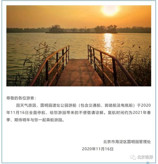 此前,11月2日,玉渊潭公园、陶然亭公园、紫竹院公园和中山公园4家市属公园的游船全面停航,公园提醒市民游客提前做好行程安排。