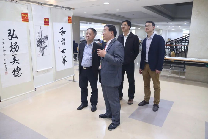 复旦大学党委副书记金海燕在报告会前会见宣讲人,并参观书画作品展,上海华源传统文化研究院院长姚龙兴陪同。抗美援朝志愿军老战士、上海市干部教育先进工作者华金才,曾在抗美援朝战争中获得一次二等功、三次三等功的何文俊,志愿军空军战士、朝鲜战场三等功获得者吴永麟,上海师范大学离休教师杨宇先后作宣讲。
