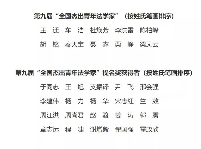 据悉,“全国杰出青年法学家”是经中央批准设立的重大奖项,受到全国法学法律界和社会各界的高度重视和关注。评选旨在通过表彰活动,为优秀人才脱颖而出和健康成长创造条件,激励广大法学法律工作者坚持正确的政治方向,锐意创新,做中国特色社会主义法治道路的践行者、社会主义法治国家的建设者、中国特色社会主义法治理论的发展者、德才兼备的社会主义法治人才的培养者。第九届评选表彰活动于2019年5月启动,原定于2019年底完成评选工作,后因新冠肺炎疫情等原因推迟。