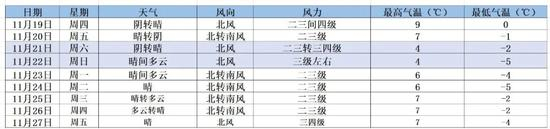 预计从11月19到27号,南郊观象台最高气温4~9℃,最低气温-5~0℃。