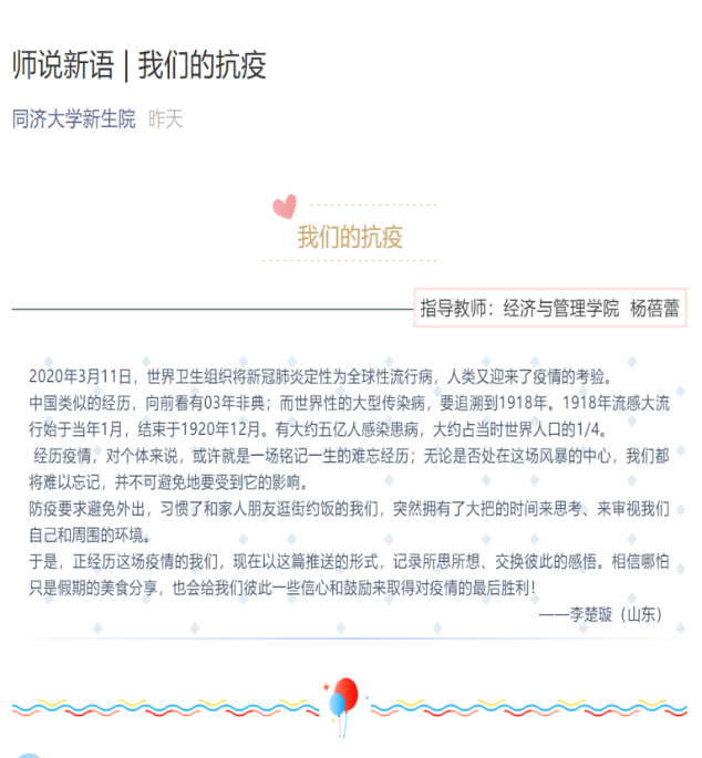 即便是在疫情阶段,导师和新生的交流也从未中断,线上开展着一期又一期的隔空对话。来自经济与管理学院的新生导师杨蓓蕾教授与她的学生交换彼此的感悟,用心记录着宅家学子的不平凡,并以推文的形式与更多的萌新们共话“我们的抗疫”。新生院青年学子也以积极向上、奋发有为的精神面貌,带给导师们一次次惊喜和欣慰。