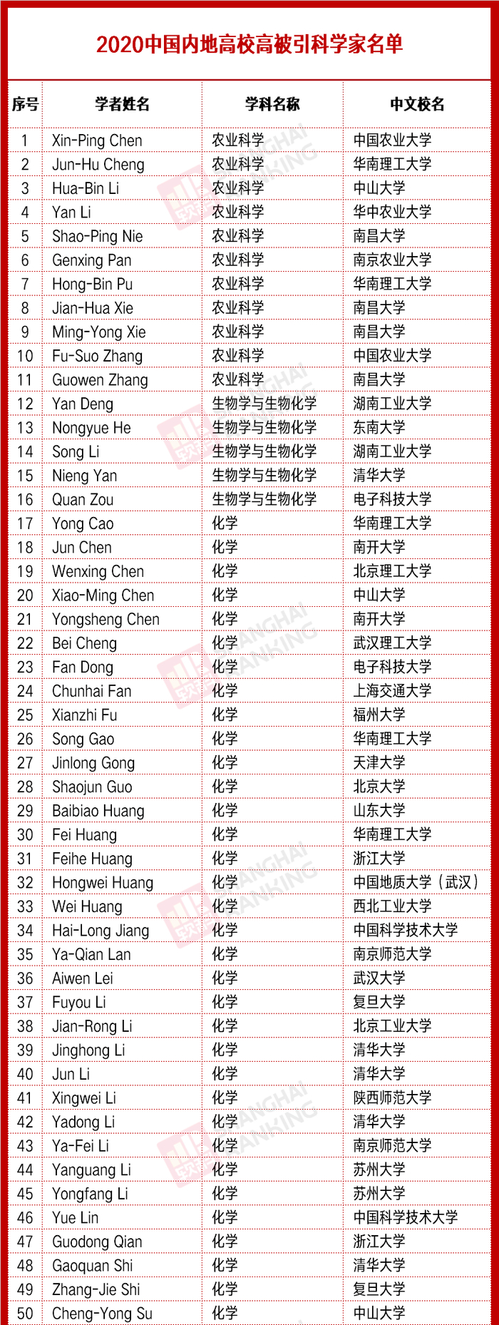 在中国内地上榜科学家中,有621人来自123所高校。2020中国内地高校高被引科学家入选统计如下: