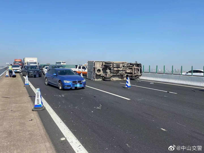 11月11日中午13时30分左右,广澳高速广州往珠海方向k53+700处,一辆白色小货车碰撞路面桥梁伸缩缝后,失控撞向前方正常行驶的蓝色小轿车,造成小轿车从超车道翻滚到应急车道,后从应急车道护栏边上掉落桥下。