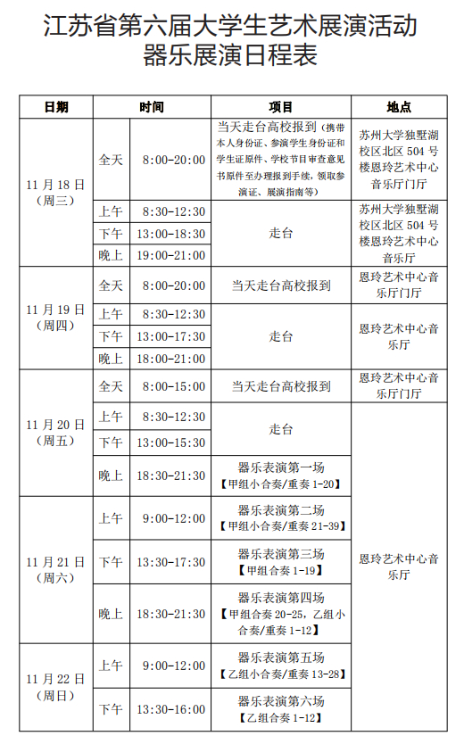 11月18日至22日,江苏省第六届大学生艺术展演(以下简称“省大艺展”)器乐展演将于苏州大学独墅湖校区举行。此次是我校第一次承办省大艺展的器乐展演活动,学校各部门、各团队高度重视、各司其职、通力合作,以期以最完美的状态,向全省63所学校的展演团队致意。
