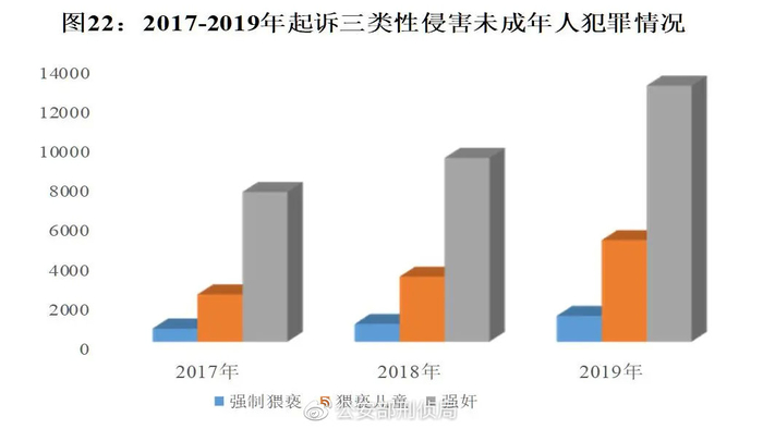 2017年至2019年,检察机关起诉成年人强奸未成年人犯罪分别为7550人、9267人、12912人,2018、2019年同比分别上升22.74%、39.33%,起诉猥亵儿童犯罪分别为2388人、3282人、5124人,同比分别上升37.44%、56.12%,起诉强制猥亵、侮辱未成年人犯罪665人、896人、1302人,同比分别上升34.74%、45.31%。与2017年相比,2019年检察机关起诉上述三类犯罪人数占侵害未成年人犯罪总人数的比例也由22.34%上升到30.72%。