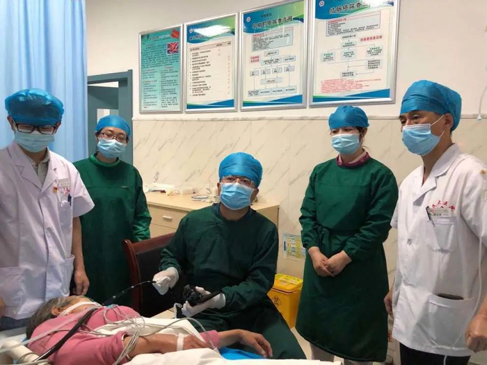 ▲郭学峰团队在为患者进行胃息肉切除手术(右三为郭学峰)(来源:新华社)