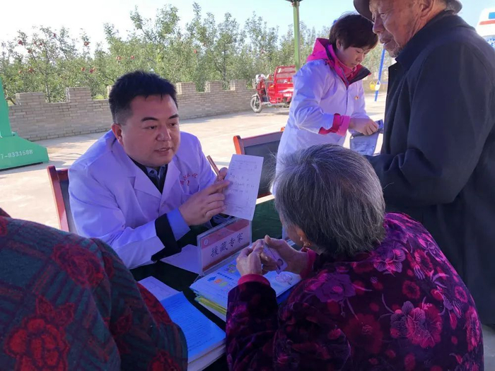 ▲郭学峰(左一)在为陕西礼泉县张咀村村民义诊(来源:新华社)