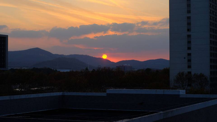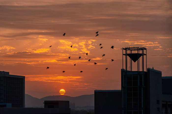 黄昏时分,活跃了一天的河海校园渐渐沉默,为天空预留下表演的舞台。大片流云追赶上西坠的落日,正打算拥抱挽留。不料,河海的高楼却无意间将云层戳破。瞬间,霞光四溢,彷佛芒果酱从流心曲奇中流出,将云天染出一条条橘红,惹得路人不禁放慢脚步,舔舔嘴巴。生活在河海的校园里,连平凡的黄昏之景也变得甜蜜起来。