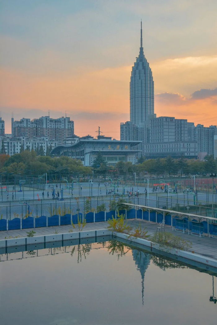 佛城西路8号的黄昏像一块软糯的戚风蛋糕,因为海盐的加入而有了明媚的蓝色。落日还未隐匿在牛首山那片连绵的山脉后,于是趁机纵那余晖为这块海盐蛋糕装点上一层精巧的拉花。浅棕的焦糖与微咸的海盐相融,汗水从畅饮汽水的学子额角滑落。在飞转的篮球间,在肆意潇洒的背影后,这份黄昏的美好以其特有的浓醇见证着水之子的烈火般张扬的青春。在过去,在今朝,也在未来。