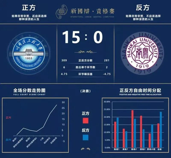 决赛场上,哈工程学子唇枪舌战,酣畅淋漓,不断输出自己的价值观,瓦解对方的逻辑结构,最终赢得了在场所有评委的选票,以15:0 的压倒性优势胜出。这样悬殊的比分在辩论场上极为少见,就连他们自己也没有想到会获得这样的成绩。