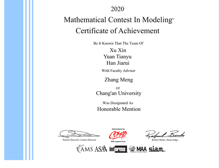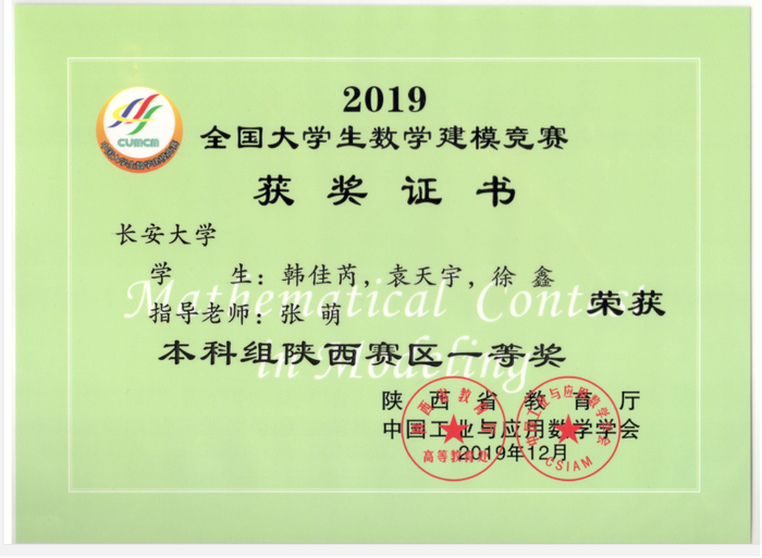 在校期间连续三年获得国家奖学金,荣获长大之星(个人)(盲投票数第一)、长安大学优秀团干部、长安大学创新创业先进个人、长安大学优秀社团工作者等荣誉称号,获得正大杯市场调查与分析大赛国家二等奖,美国大学生数学建模竞赛国际二等奖、全国大学生数学建模比赛陕西省一等奖等两项国家级、四项省级数学奖项,两篇论文分别被WTC(国际会议)收录及《会计之友》(北大核心)录用,拥有实用新型专利一项,主持并参与大学生创新创业科研项目国家级一项,省级三项,中央高校科研项目一项。