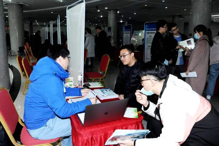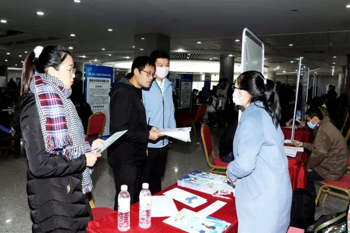 在青岛科技大学崂山校区图书馆内的招聘会现场,山东新华制药股份有限公司、英科医疗科技股份有限公司、东岳集团等54家淄博市企业与学校1000余名师生进行了交流对接。