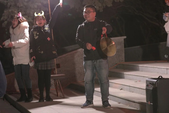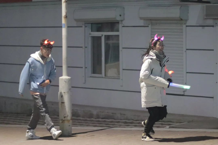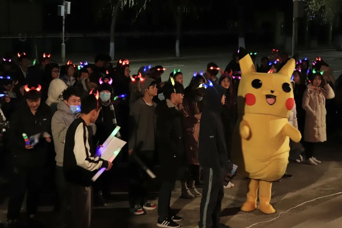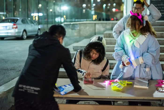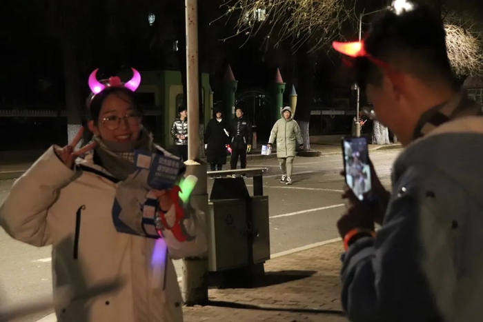 此外,主办此次活动的经管学院团委还定制了荧光手环、采购了荧光棒、荧光头饰等物品,分发给参与者进行佩戴。缤纷的小物件也成了夜幕下校园里的一抹亮色,吸引了无数同学纷纷驻足并询问工作人员活动内容。