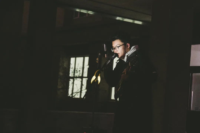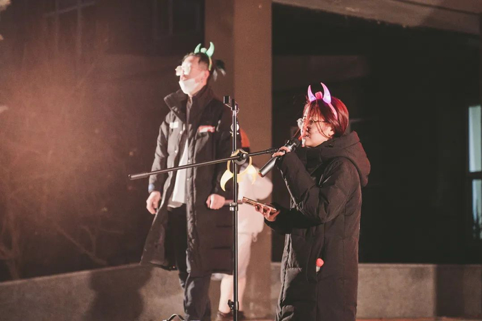 在荧光夜跑活动开始之初,活动发起人邀请了牛牧源同学进行弹唱表演,邀请哈工大十佳歌手、哈工大跨年晚会歌手白羽心同学献唱《夜空中最亮的星》,现场气氛被两支歌推向高潮。