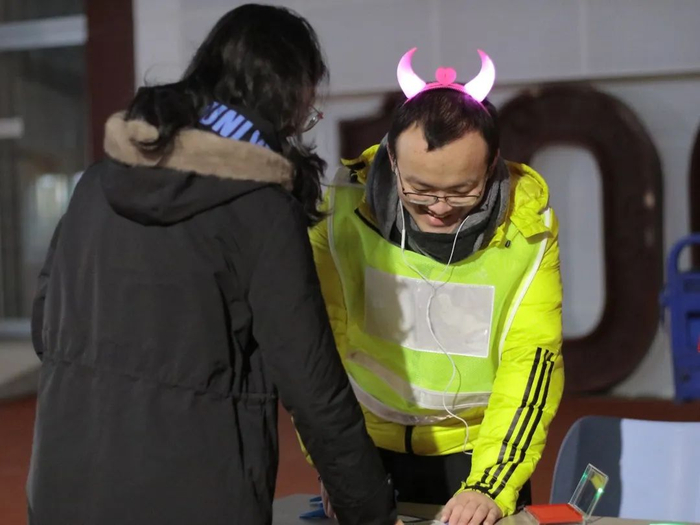 已经打卡完最后一个点时,人文学院的祁同学小心翼翼摘下了荧光牛角头饰放进了口袋。她兴奋地表示,荧光头饰和手环很好看,和大家一起绕着学校奔跑的感觉也特别好。有小伙伴陪着一起走过亮着排排灯光的教学楼、红白相间的跑道,能够一起欣赏晚上的校园,很幸福。
