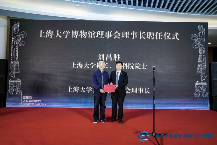 开幕式首先举行了上海大学博物馆第一届理事会理事长聘任仪式,由刘昌胜校长为上海大学文博专业创始人袁俊卿颁发了聘书。