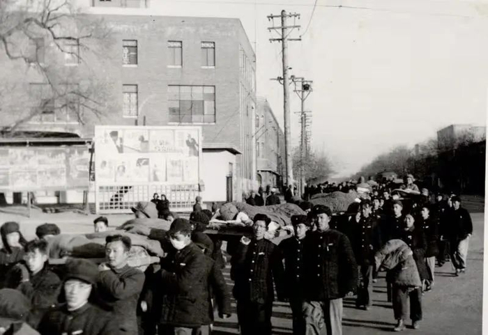 东北人民大学担架队的学生们,稳步、抬平、小心地护送着在朝鲜前线光荣负伤的志愿军战士