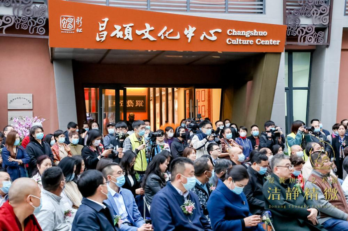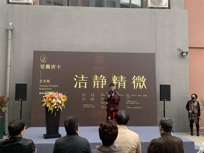 11月21日下午,上海宁虹路1122弄昌硕文化中心,“觉囊唐卡艺术展”的开幕式上,一幅《释迦摩尼佛》唐卡被赠送给了上海昌硕文化中心,画面构图讲究,线条精美,每种色彩都被反复点染,正是色钦拉姆的作品。