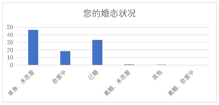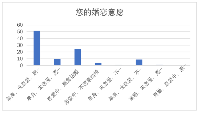 在恋爱和结婚的状况及意愿调查中,“已婚”占33.2%,未婚的青年中,选择“单身,未恋爱,且愿意恋爱和结婚”的人数最多(占51.3%),选择“恋爱中且愿意结婚”(占24.6%)远远高于“恋爱中但不愿结婚”的人数(占3.6%);还有9.6%和8.7%的青年分别选择了“目前单身,愿意恋爱但不愿结婚”和“单身,既不愿意恋爱也不愿意结婚”的意向。