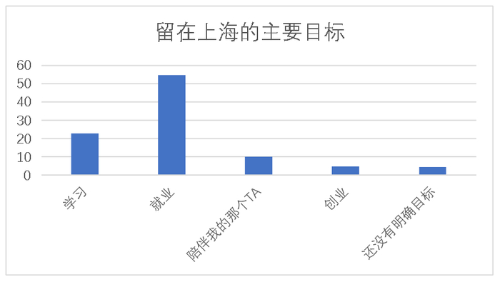 青年在上海的主要目标是“就业”,在沪“创业”的热情需进一步加强。受访青年留在上海的主要目标中,选择比例最高的是“就业”(占54.8%),其次是“学习”(占22.8%),再次是“陪伴亲人/友人”(占10.0%)和“创业”(占4.7%)。