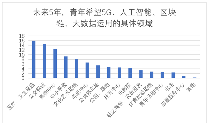 在对公共服务的进一步发展的期待上,青年需求更集中在与其生活关系密切医疗、教育、交通出行等领域的服务设施的现代化。在调查中,受访青年对于未来5年,在5G、人工智能、区块链、大数据运用的具体领域中,排在前五位的项目是:医疗、卫生设施(16.0%)、公交枢纽(15.0%)、购物中心(12.4%)、中小学校(9.3%)、文化艺术场馆(8.3%)。