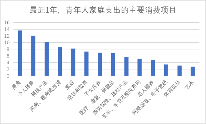 对青年人最近一年消费支出前五位的项目的数据统计结果显示,青年消费内容比较多元:美食位列第一(13.6%),其次是个人形象(12.1%)和科技产品(10.2%),青年人在买房/租房/房贷上的消费支出和用于旅游的消费比例相近(8.6%和8.2%)。