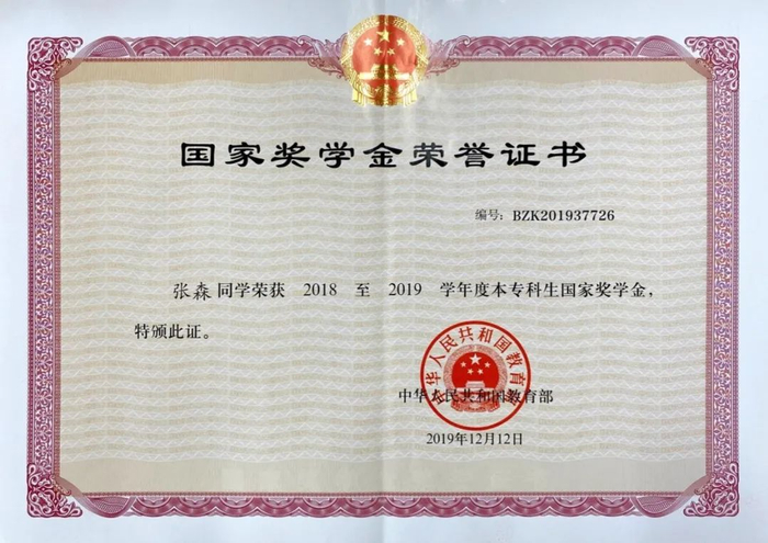 曾获得优秀学生奖学金、国家励志奖学金、国家奖学金和宝钢优秀学生奖学金,连续三年荣获青岛理工大学“优秀学生标兵”、“优秀团员”荣誉称号,2020年被评为“山东省优秀学生”。