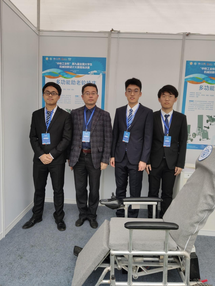 由刘静老师指导,邵俊凯,兰崧友,陈晨,刘逸果,戴翔同学设计的作品“多功能助老轮椅床”,在电动轮椅的基础上嵌入了自主设计的一组基于平面连杆的变胞机构,不仅具有电动轮椅和床的一般特征,还具有辅助老人从床上坐立、收腿以及辅助老人上下床的特殊功能,荣获大赛一等奖。