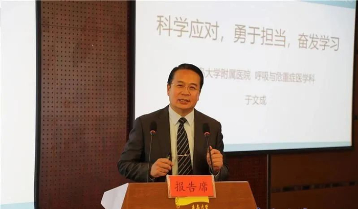 在这次抗击新型冠状病毒肺炎的战役中,55岁的他毫不犹豫的又逆行走向“前线”,担任此次援鄂医疗队医疗专家组组长,成为整个援鄂医疗队的“定心丸”。他以“科学应对、勇于担当、奋发学习”为题进行授课,没有过多地分享自己以及团队取得的成绩,而是从传染性疾病的三大要素:传染源、传播途径、易感人群角度出发,讲述了我国在疫情防控中采取的居家隔离、在疫情严重地区建立方舱医院,武汉封城等一系列措施的科学意义及价值。“只有在中国共产党领导下的社会主义国家,才能够“万众一心、众志成城”,这是于文成在讲到这次援鄂任务完成后他最大的感悟。