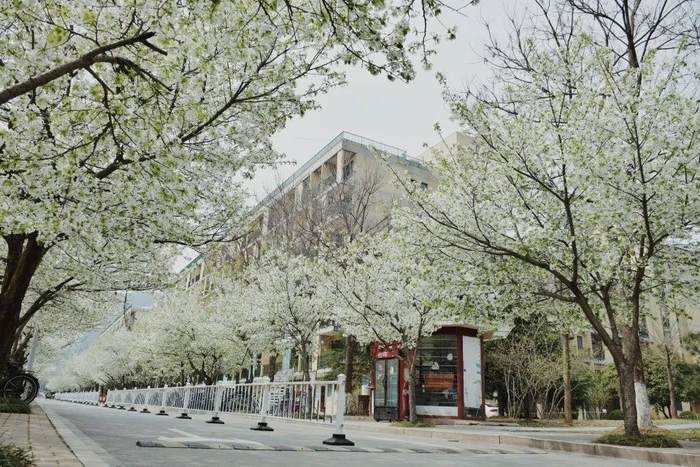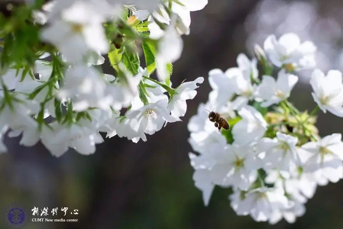 矿意:形容走在矿大的樱花大道上,樱花伴着风落下,飘成一条跟着学子共同前行的花路。