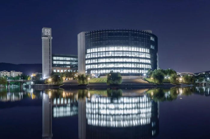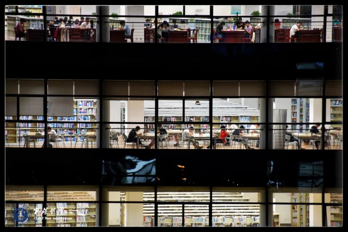 矿意:指深夜里依然有孜孜不倦的学子在图书馆里求学,在镜湖的陪伴下挑灯夜战。