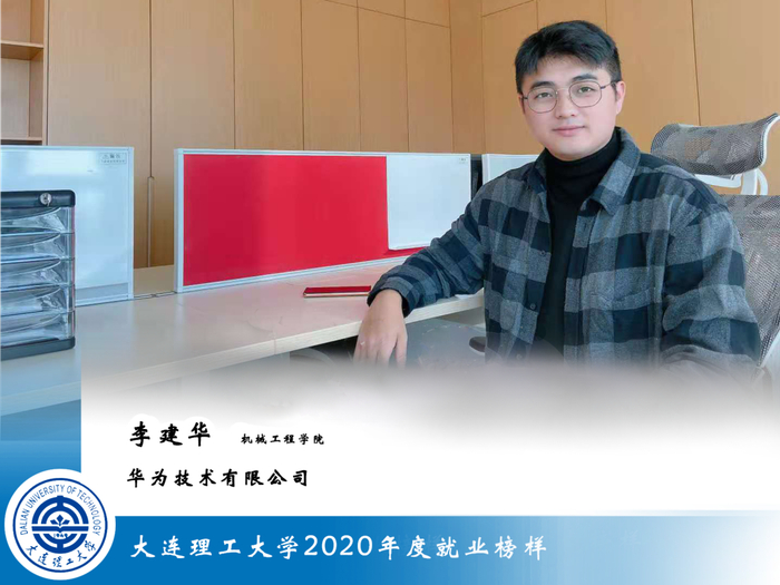 李建华,男,机械工程学院2020届本科毕业生,现已与华为技术有限公司签约,工作岗位为客户代表。该生在校表现良好,学生会期间举办“女生节”、“悦动杯”等面向全校的大型学生活动,获校学生会优秀干事、副部长等荣誉。连续三年任职于大连理工大学职业规划与就业协会,明确求职方向,全心全意搞求职。组织并参与“求职工作坊”、“大工career讲坛”等指导类求职活动,完善求职技能,提高个人水准。大三暑假,参加报国企业行,走访华为、中广核等知名企业。最终签约华为技术有限公司,落办黑龙江,服务东北振兴东北,为国产技术的自研、可控贡献自身价值。