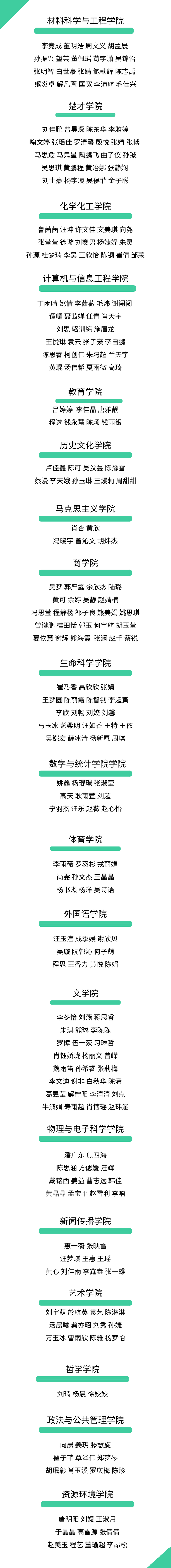 学习成绩列班级和专业第一,连续四年获得一等优秀学生奖学金,并四次获甲等学习成绩优秀奖学金。参与导师课题,目前以第一作者发表论文三篇、主持一项国家级大创项目、有三项软件著作权。先后担任专业班级班长、院学生会主席团成员等学生干部职务,曾获湖北大学“三好学生标兵”、“优秀学生干部”、“先进工作者”等荣誉表彰。在全国大学生英语竞赛、“互联网+”创新创业大赛、美国大学生数学建模竞赛等比赛中获奖,参加了美国德克萨斯州奥斯汀分校的游学活动。