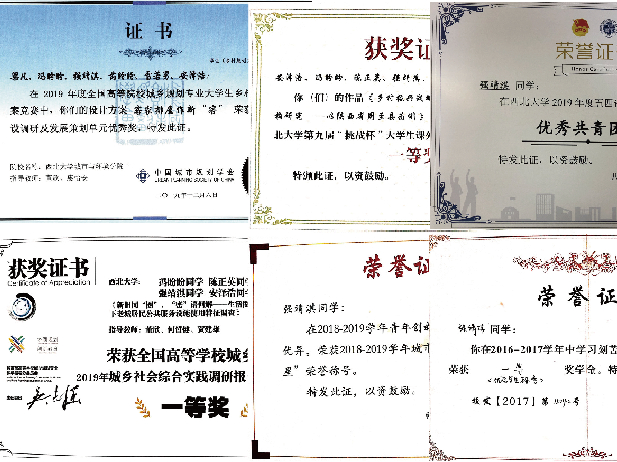 曾获国家励志奖学金,多次获校一、二等奖学金;连续三年获全国大学生环保知识竞赛优秀奖、西北大学青年马克思主义培养学校第十二期优秀学员、城乡规划社会综合实践调研全国一等奖等;国家大学生创新创业训练计划项目,结题优秀;西北大学第九届“挑战杯”课外学术科技竞赛一等奖、2019年陕西省第十二届“挑战杯”竞赛 二等奖等。