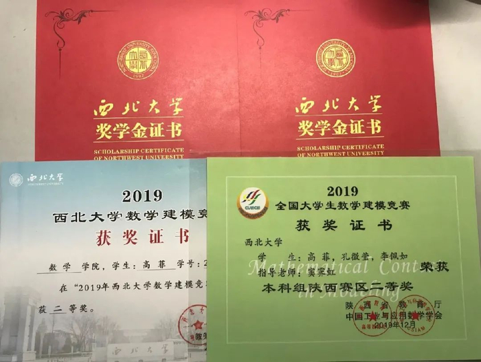 曾获全国大学生数学建模,国家一等奖博雅方略奖学金,多次获得校一、二等奖学金,获西北大学数学建模一、二等奖,获2019年Esri杯中国大学生GIS软件开发竞赛优胜奖;参与国家大学生创新创业训练计划项目,结题优秀,