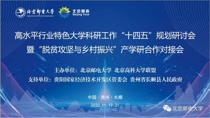 11月19-21日,高水平行业特色大学科研工作“十四五”规划研讨会暨“脱贫攻坚与乡村振兴”产学研合作对接会在北京邮电大学定点帮扶县贵州省长顺县顺利召开。本次会议由北京邮电大学和北京高科大学联盟联合主办。