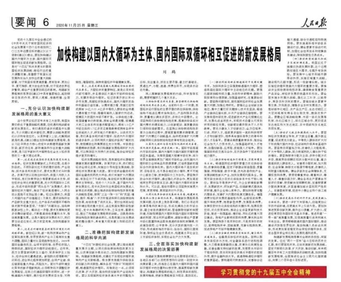 11月25日,中共中央政治局委员、国务院副总理、国务院金融稳定发展委员会(以下简称金融委)主任刘鹤在《人民日报》发表署名文章,详解加快构建以国内大循环为主体、国内国际双循环相互促进的新发展格局的背景、内涵及其实施路径。