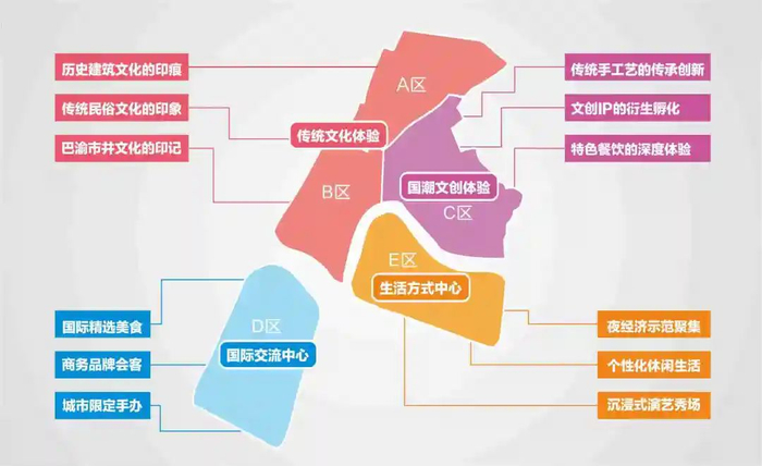 值得一提的是,在十八梯传统风貌区着重规划的“生活方式中心”E区,规划建设了“潮乐青年聚集地”。钟飞鹏表示,这一区域将以夜经济娱乐聚集、个性化休闲生活、沉浸式演艺秀场为发展方向,旨在打造极具活力的城市复合生活空间,为消费者提供专属夜宴、夜饮、夜唱、夜玩、夜购的“五夜狂欢”。