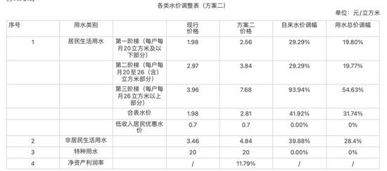 居民生活用水三个阶梯水价标准分别为2.56元/立方米、3.84元/立方米、7.68元/立方米,分别比现行价格涨29.29%、29.29%、93.94%;新设居民合表水价标准为2.81元/立方米;低收入居民优惠水价维持0.7元/立方米不变;非居民生活用水收费标准调整为4.84元/立方米,比现行价格涨39.88%,特种用水价格维持20元/立方米。整体净资产利润率约11.79%。