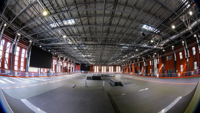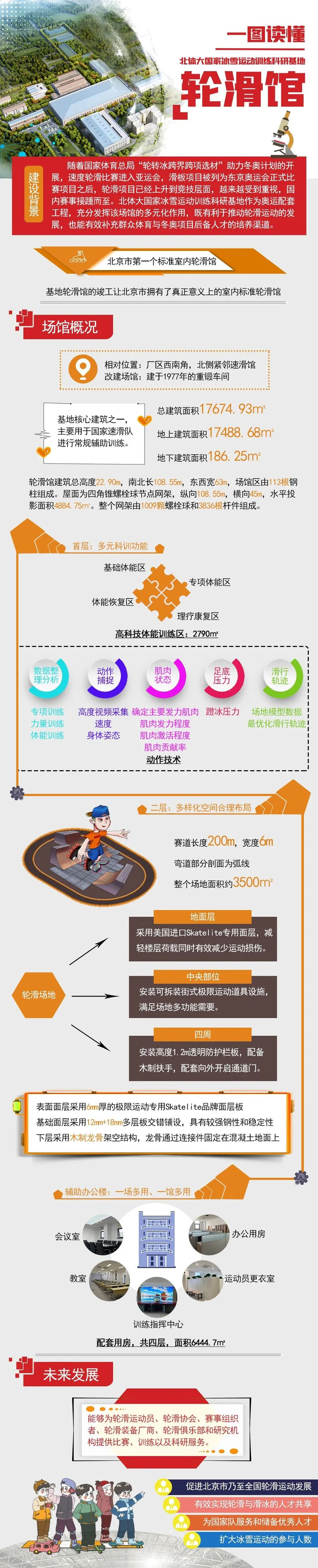 轮滑馆分为两层,首层包含体能训练区、力量训练区以及篮球场地、羽毛球场地、器材库等高科技体能训练区。二层为室内轮滑场地。为了充分利用场地,二层场地中央部位安装了可拆装的街式极限运动道具设施,满足整个场地的多功能需要。