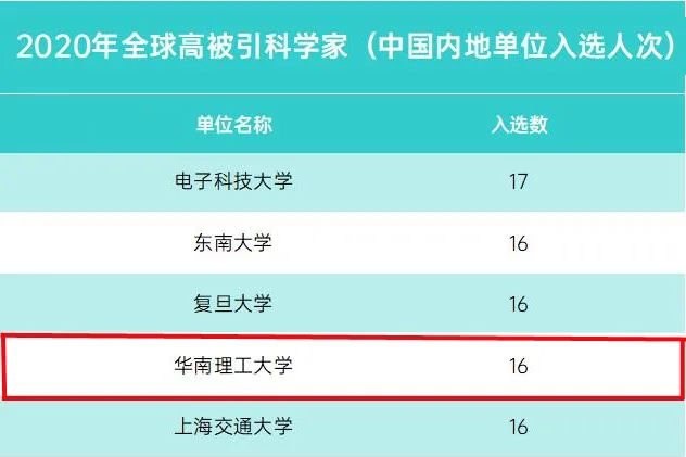 近日,科睿唯安发布了2020年“高被引科学家”名单,全球60多个国家和地区的6167位来自各领域的高被引科学家入榜,中国内地共计770人次上榜。其中,华南理工大学13名学者16人次入选,入选人次在内地高校并列第8位,比2019年前进1位。